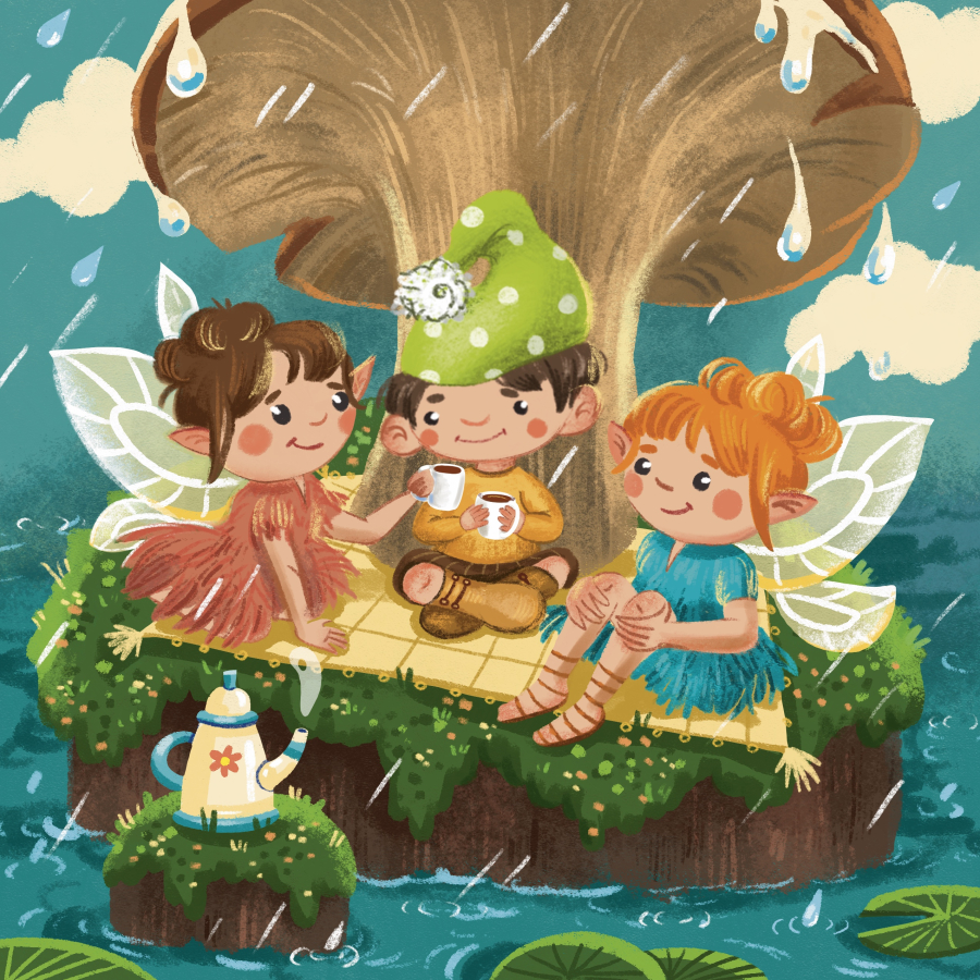 притулок під великим грибом, де на нього вже чекають феї з ароматним чаєм. Разом вони гріються,